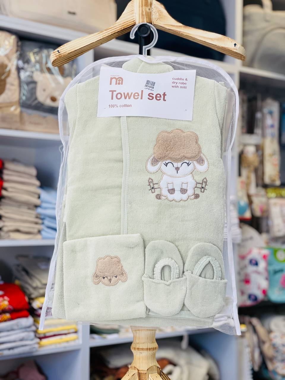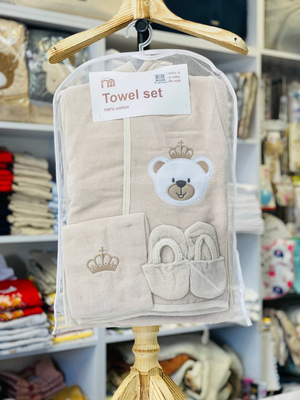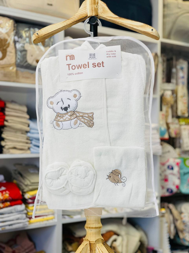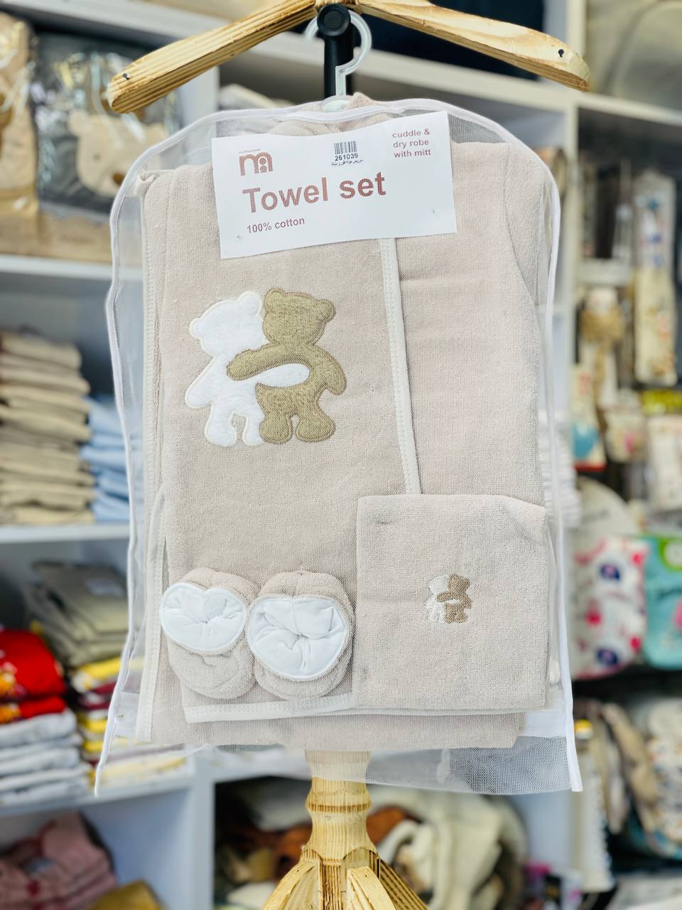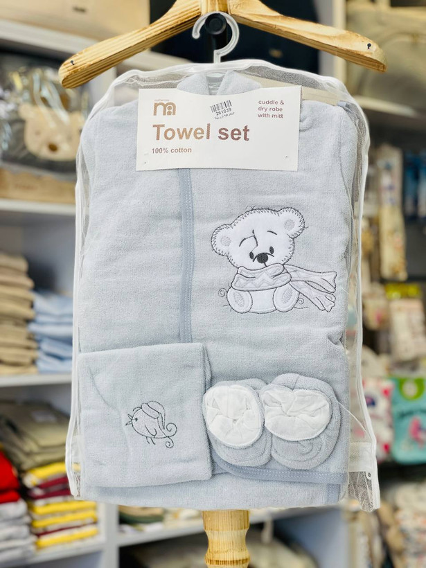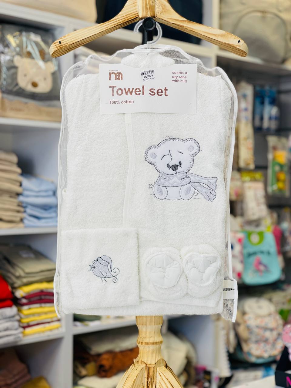 این ست شامل حوله تن پوش، حوله دورپیچ کلاه دار، لیف و یک جفت پاپوش نوزادی است.