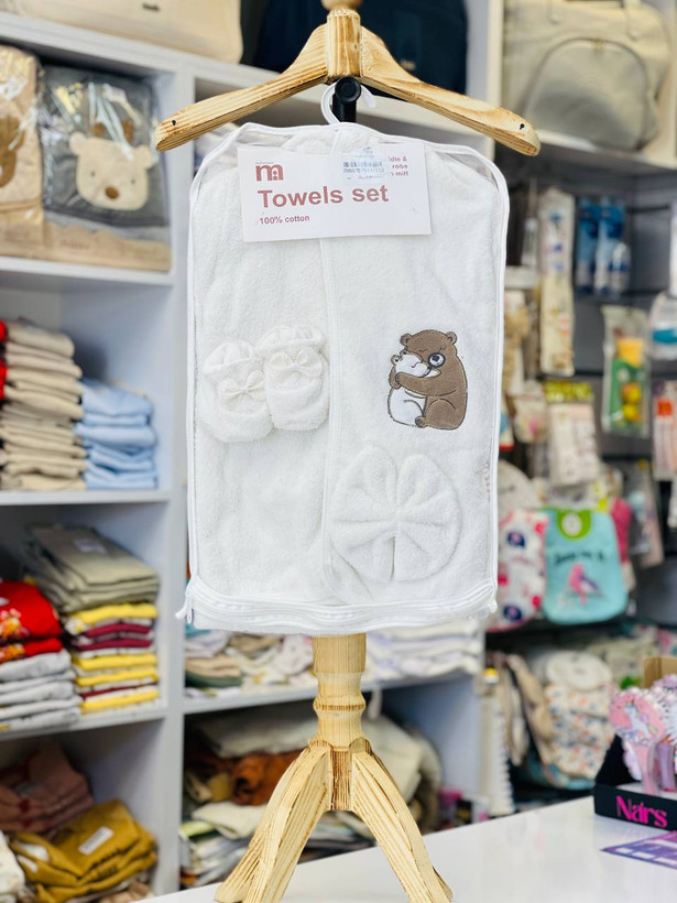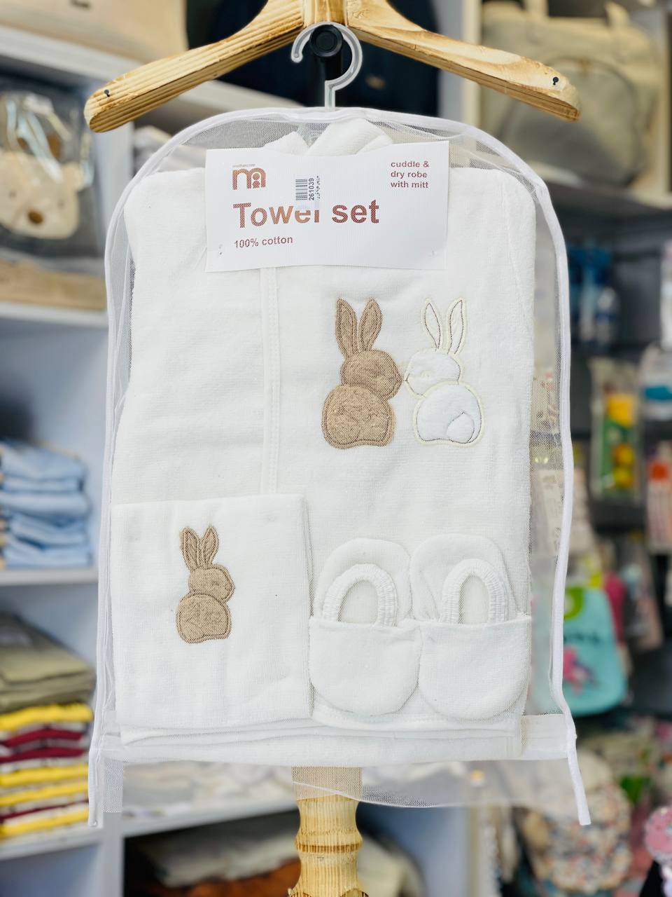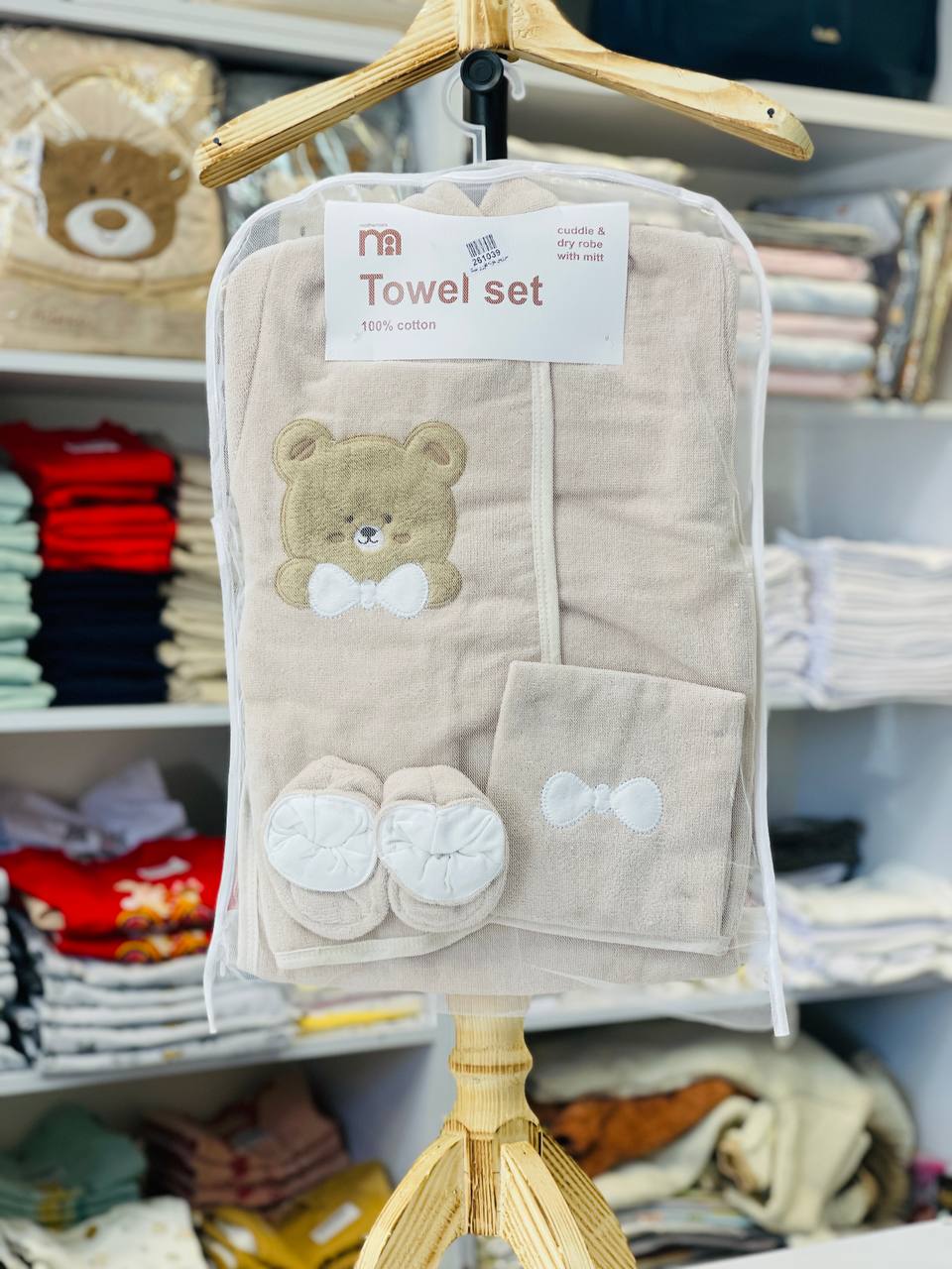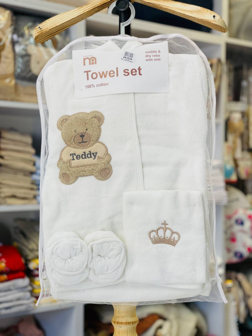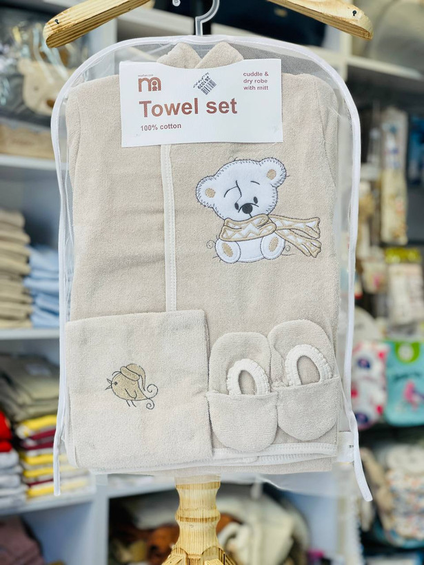 این ست شامل حوله تن پوش، حوله دورپیچ کلاه دار، لیف و یک جفت پاپوش نوزادی است.