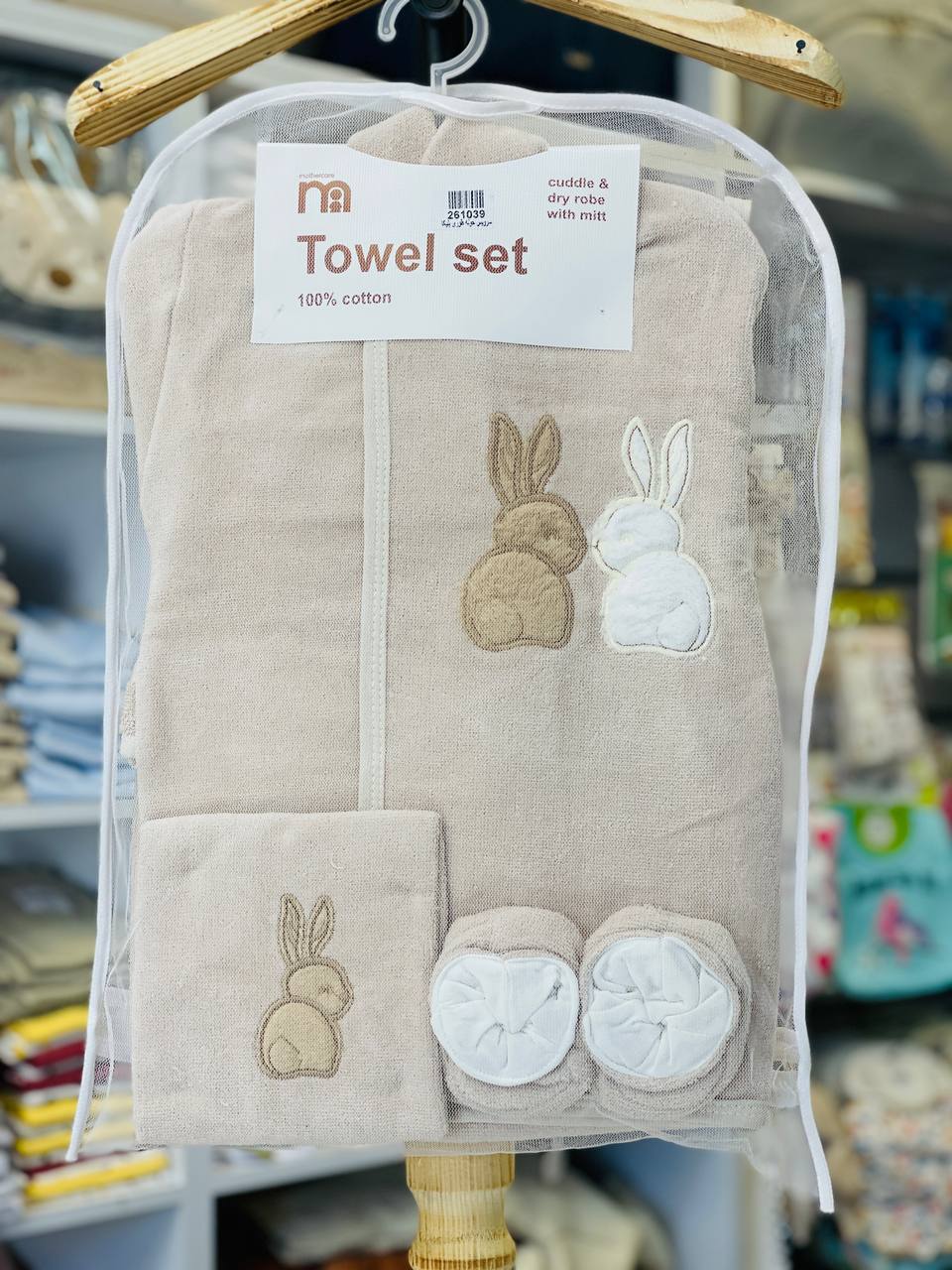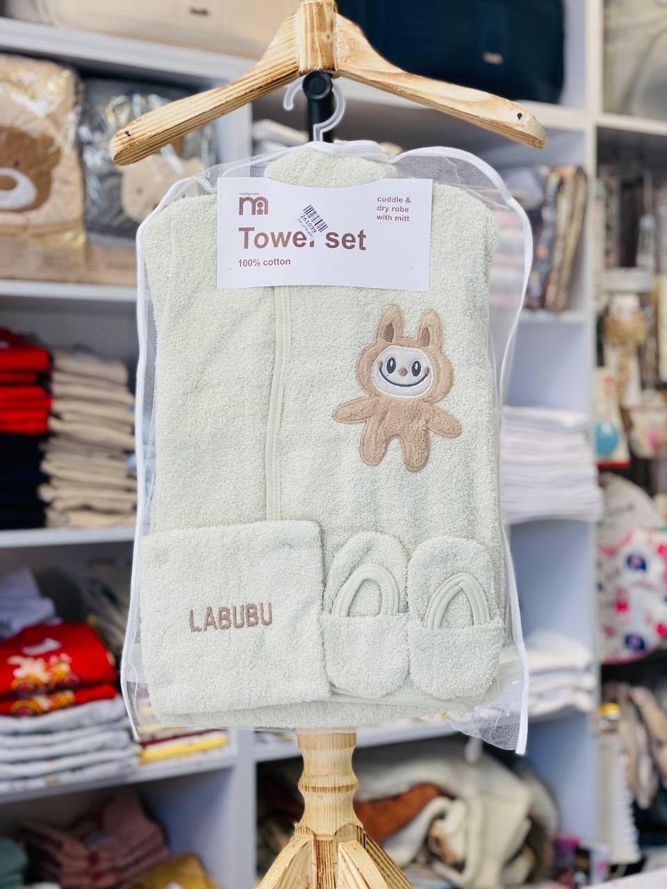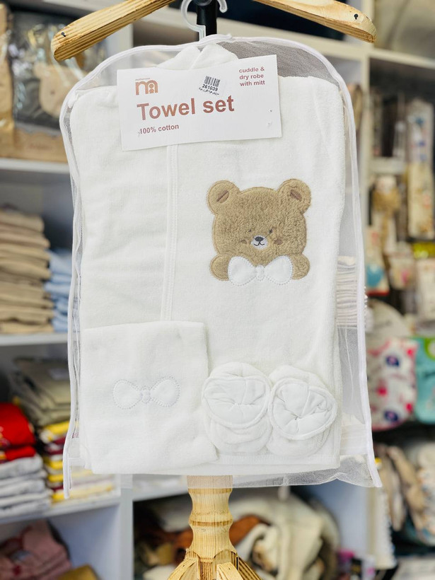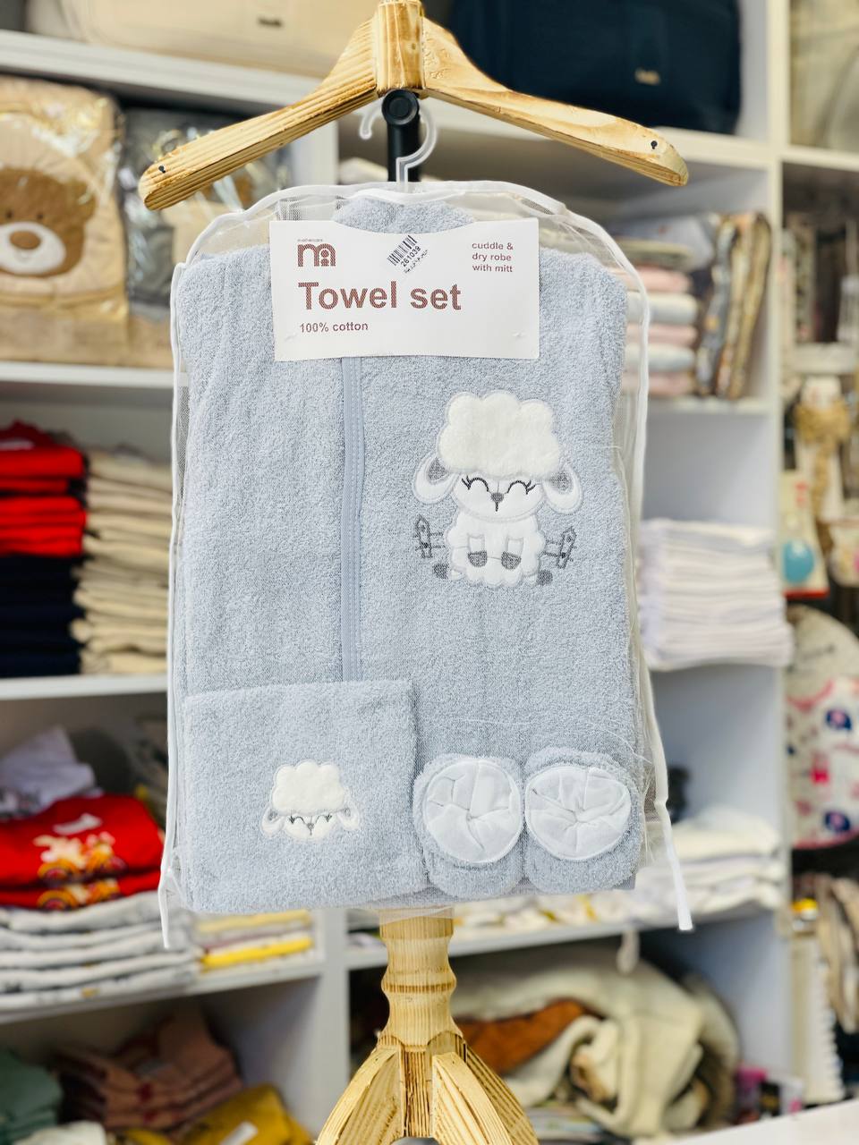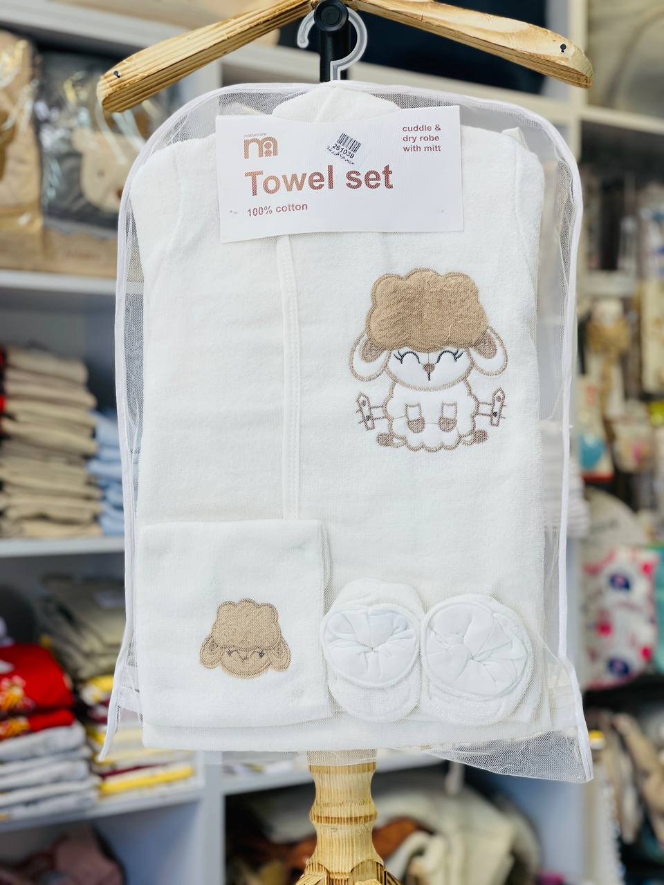 این ست شامل حوله تن پوش، حوله دورپیچ کلاه دار، لیف و یک جفت پاپوش نوزادی است.